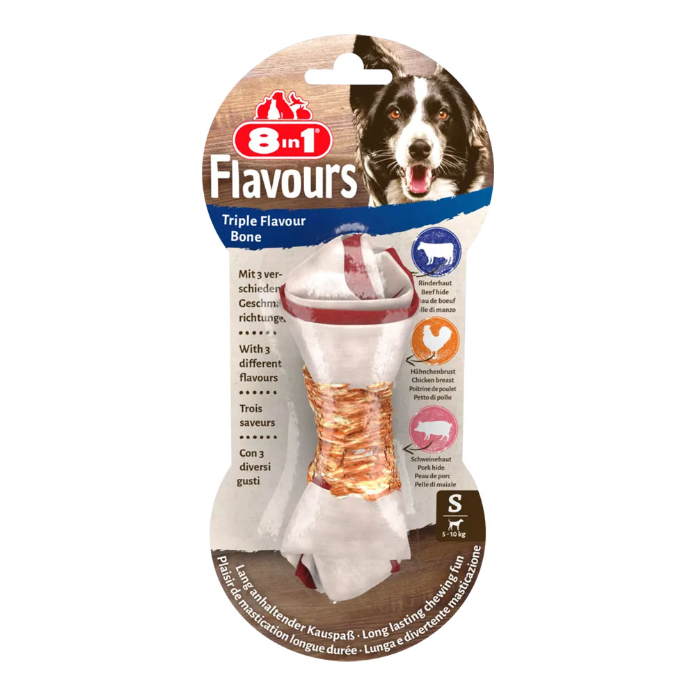 Triple Flavor S, 35 g. Täiendsööt täiskasvanud koertele (2-27 kg). 8in1 Triple Flavor on patenteeritud (GB) närimiskondid: sea- ja veisenahast, mille ümber on kana rinnafilee. Hoiab teie lemmiku õnnelikult tegevuses, tagades pikajalise närimisrõõmu. Aitab hambakivi tekke ja hambakatu moodustumist kontrolli all hoida. Valgurikas, ilma suhkru, maitsetugevdajate, GMOde ja kunstlike säilitusainetet. Koostis: liha ja loomsed derivaadid (52% veisenahk, 25% seanahk, 8% kana rinnafilee), köögivilja derivaadid, mineraalid. Analüütiline koostis: valgud 80%, rasvad 5%, toortuhk 3,5%, toorkiud 1%