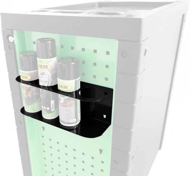 Aerosooli hoidik (4 pudelit) tööriistakärule, must PERFO – 10x10mm/28mm JBM on praktiline lahendus spreipurkide ja pudelite korrashoiuks töökojas. Kinnitatav perforaatorpaneelile või tööriistakärule, sobib pudelitele läbimõõduga 65–67 mm.