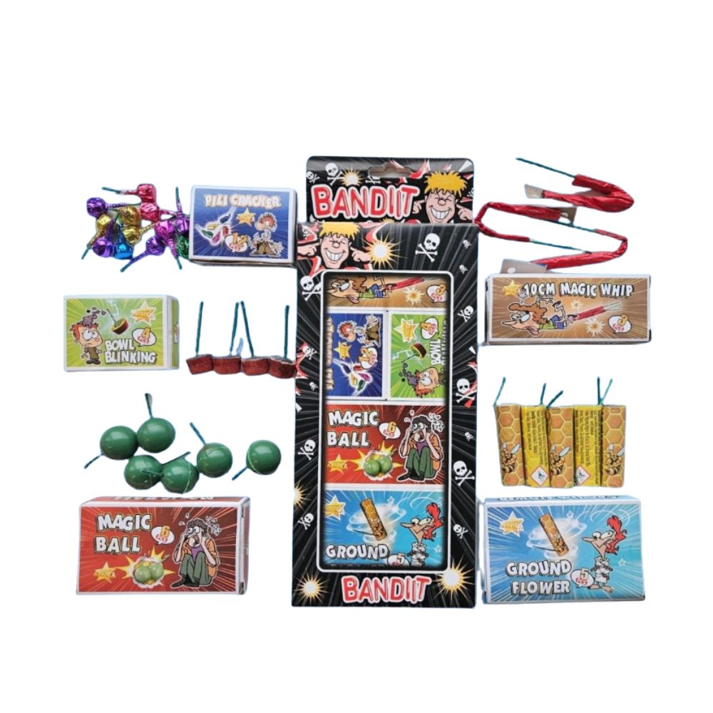 UUS BANDIIT on mitmekesine pürotehnikakomplekt noorele huvilisele. Pakendis on viis erinevat toodet, mis pakuvad mängulist ja turvalist algust pürotehnika maailmas.