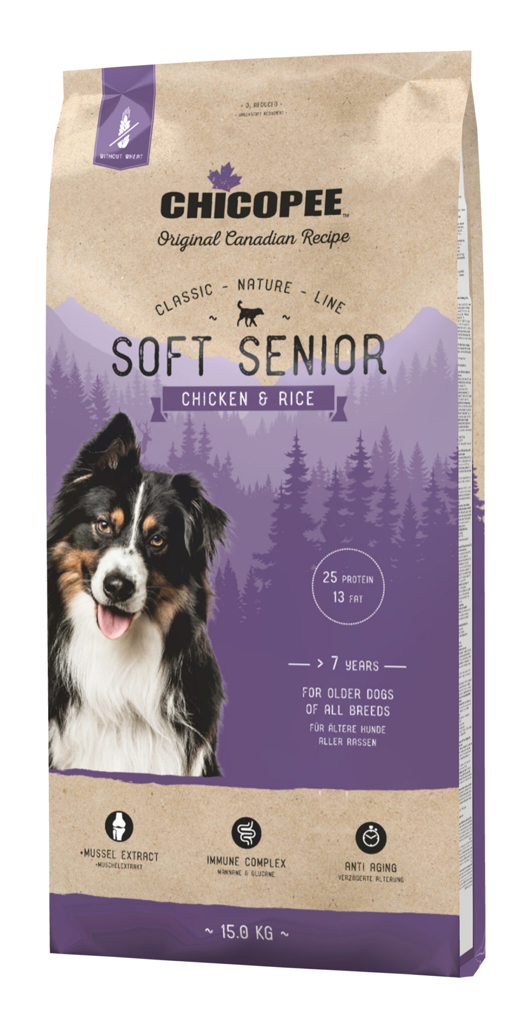 Chicopee kana ja riisiga täissööt igat tõugu eakatele koertele.