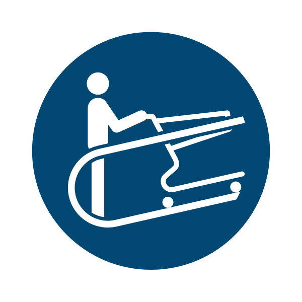 Käru käepideme hoidmise hoiatuse kleebis tuletab meelde ohutut käitumist, julgustades hoida käru käepidemest, et tagada parem kontroll ja vältida õnnetusi tööstus- või laoaladel.