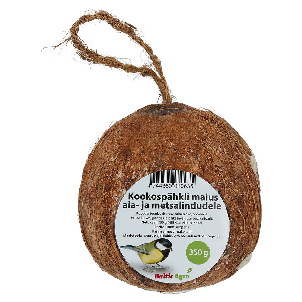 Kookospähklis maius lindudele 350g on looduslik ja energiarikas lisasööt, mis pakub lindudele toitaineid külmal ajal. Kolme avaga kookospähkel sobib hästi puuokstele riputamiseks ning meelitab ligi erinevaid linnuliike.