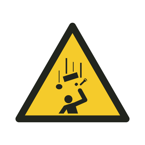 Kukkuvate esemete oht kleebis hoiatab selgelt piirkonnast, kus võib esineda esemete kukkumise riski kõrgustest, ning aitab ennetada vigastusi ehitusplatsidel, ladudes või tööstusaladel.
