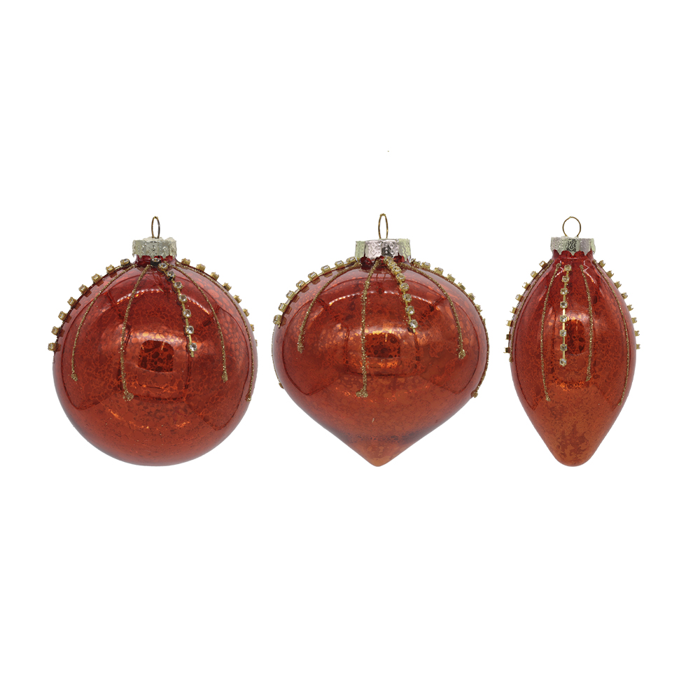 Kuuseehe klaasist antiik punane toob jõulupuule nostalgilise ja elegantse hõngu. Sädelevate triipude ja kristallidega kaunistatud ehted on saadaval kolmes klassikalises vormis.