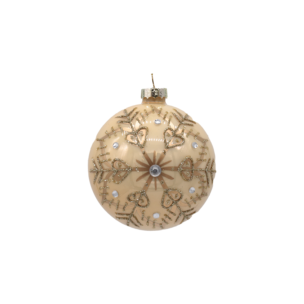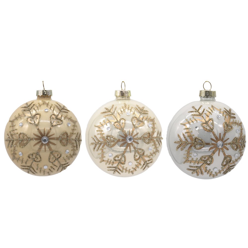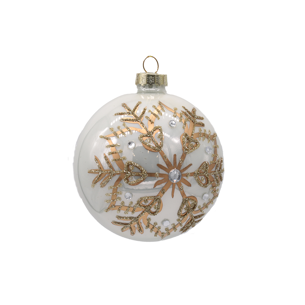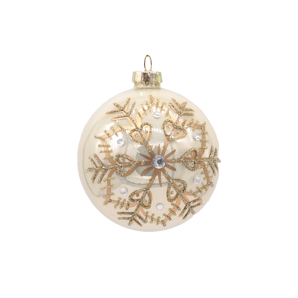 Pärlmutter läikega kuuseehe lumehelbemustriga lisab kuusele talvist sära ja pidulikku elegantsi. 80 mm läbimõõduga klaaskuulid on kaunistatud detailse kuldse lumehelbe mustriga.