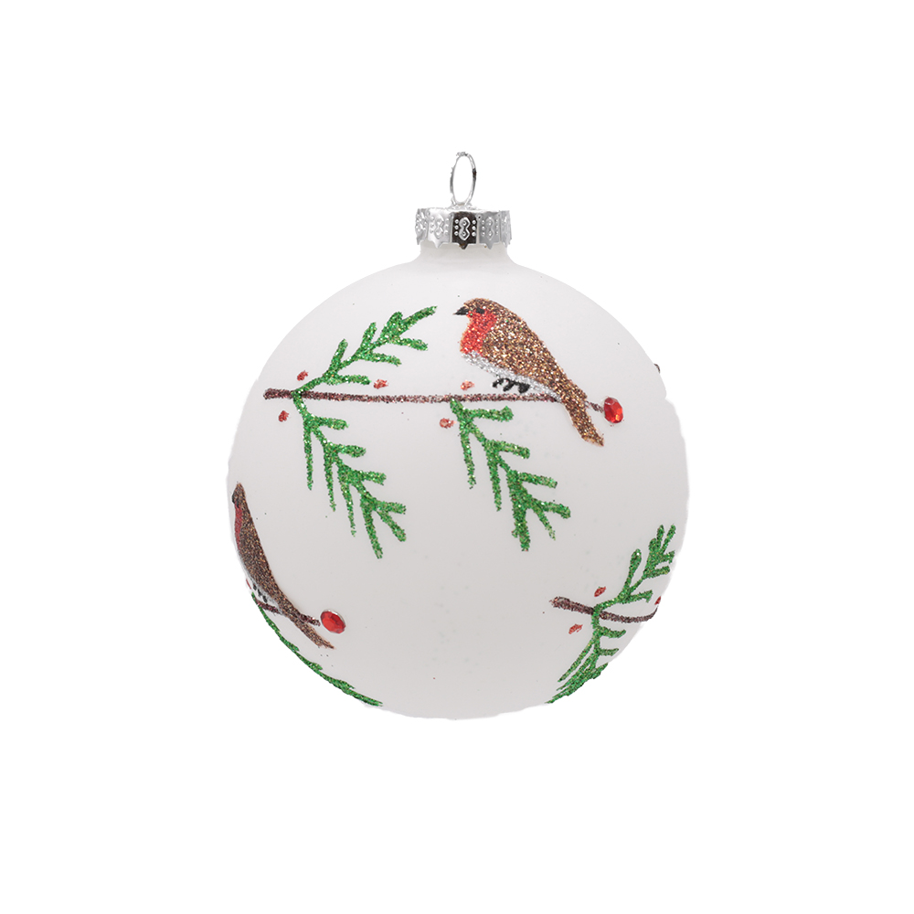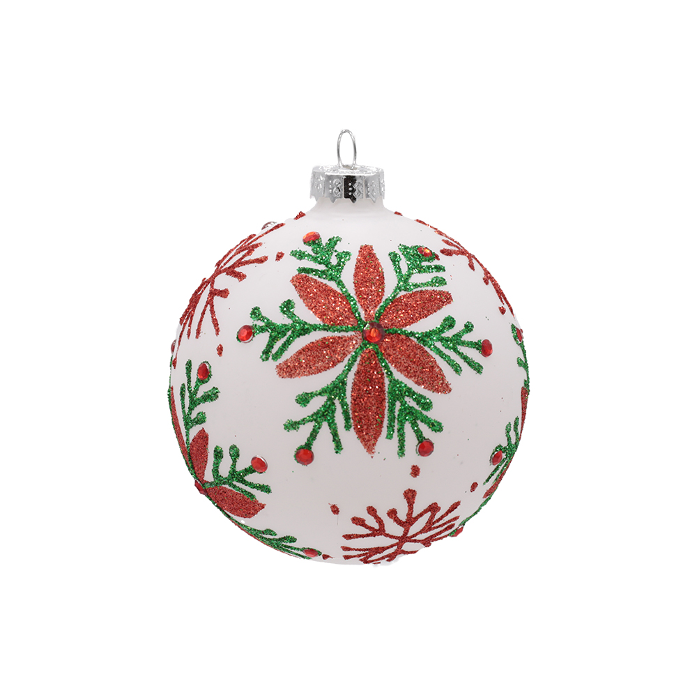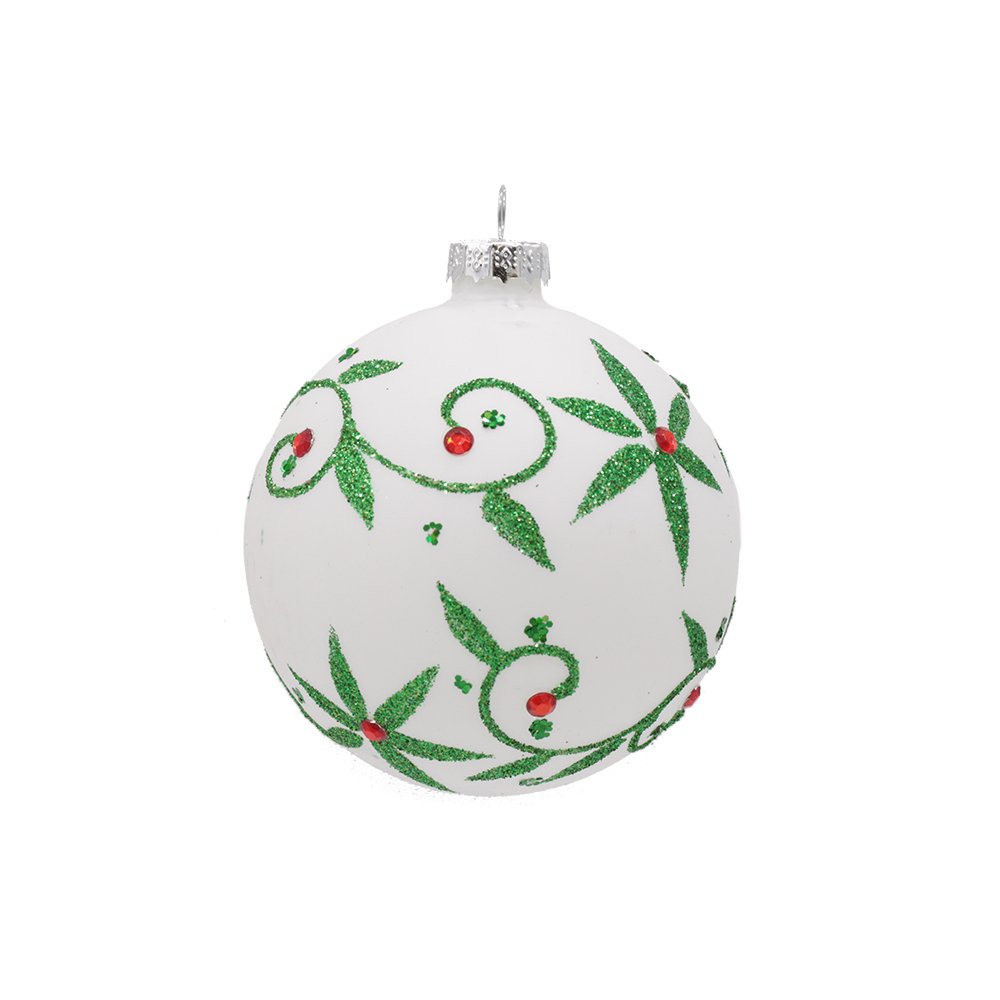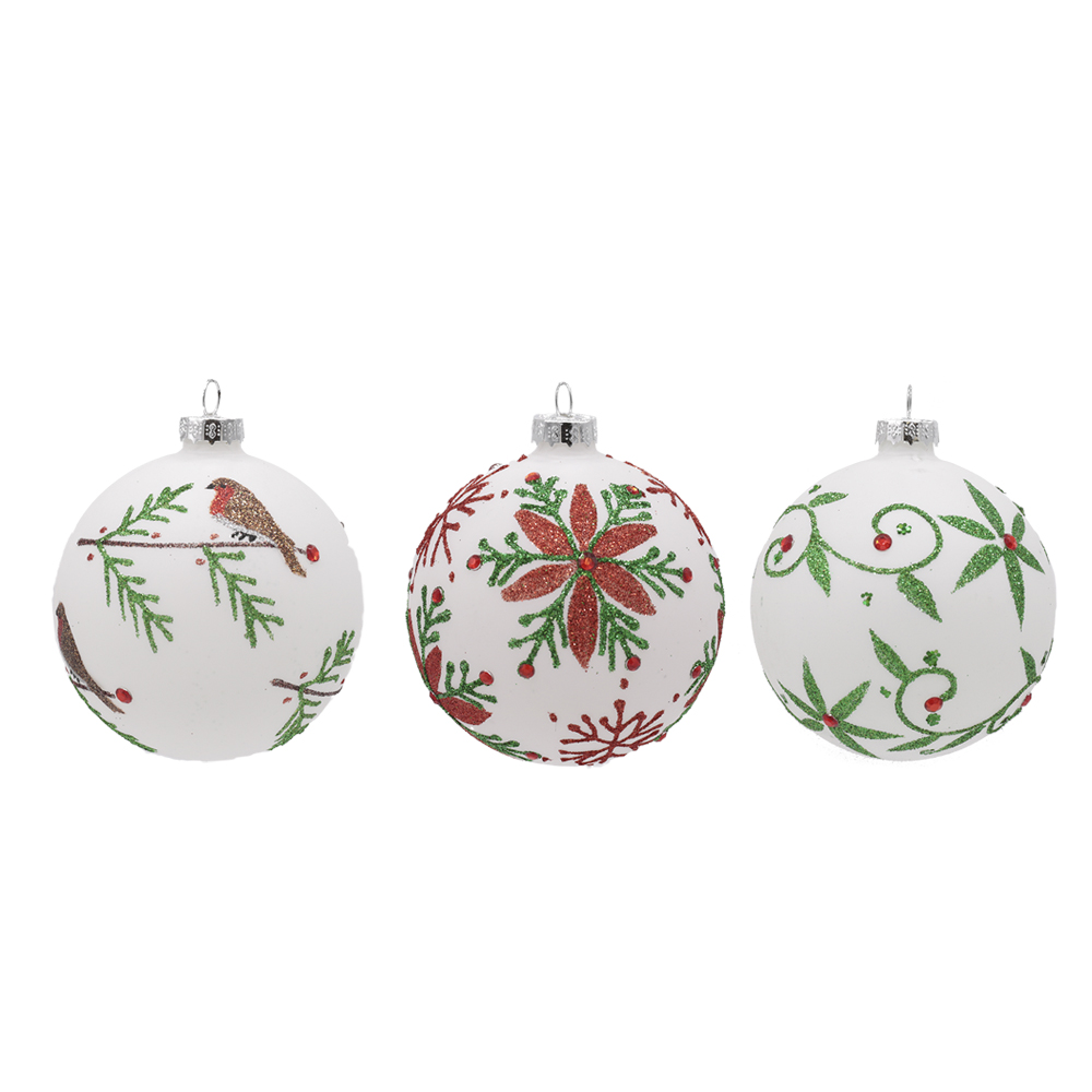 Kuuseehe valge ornamentidega lisab jõulupuule klassikalist ilu ja detailset kujundust. Valged klaaskuulid on saadaval kolmes erinevas mustris: linnud, jõulutähed ja rohelised taimed.