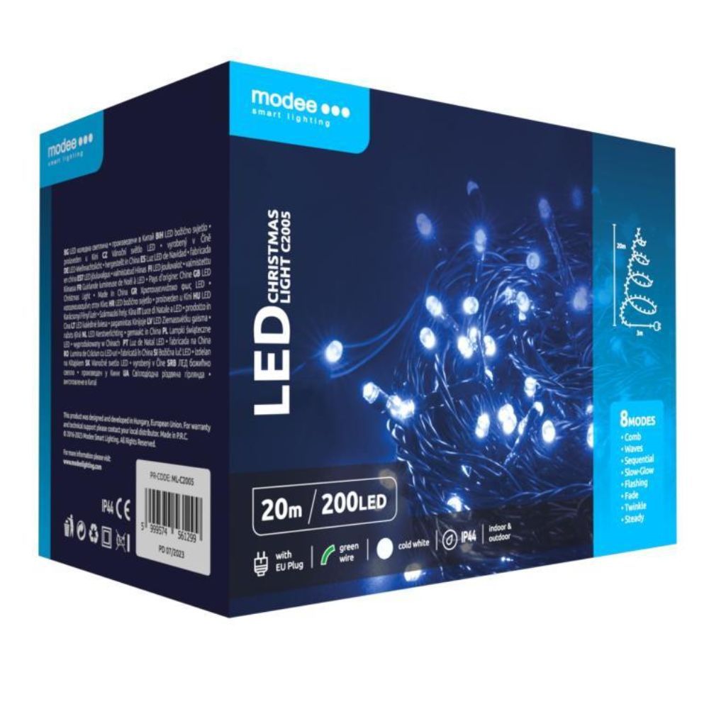 LED-valguskett Modee C2005 200LED/20m, 3,6W, 6000K, 230V on ideaalne valik, kui soovid luua kirkalt särava ja puhta valgusega dekoratsiooni. Sobib kasutamiseks nii sise- kui välistingimustes tänu ilmastikukindlale disainile.