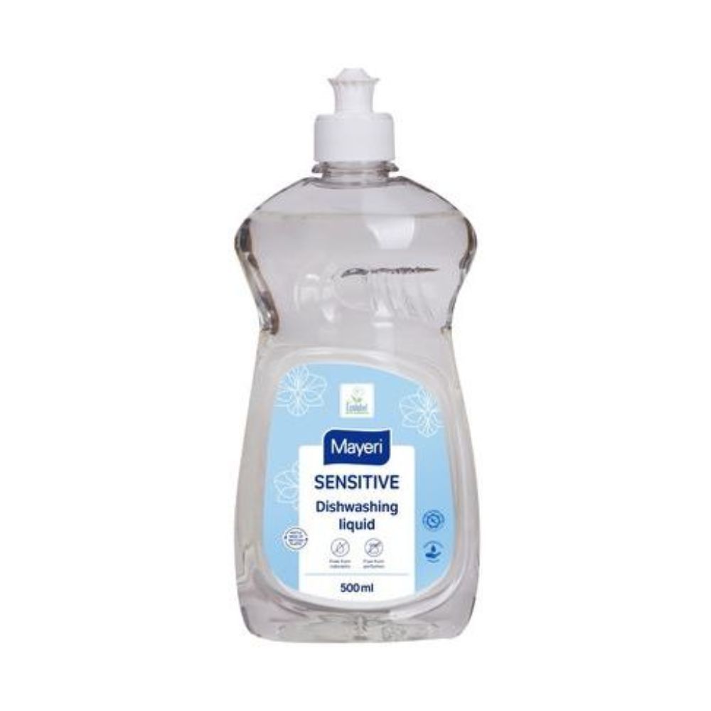 Mayeri Sensitive kontsentreeritud nõudepesuvahend, 500 ml on ideaalne valik neile, kes eelistavad keskkonnasõbralikke ja nahale õrnu tooteid. Sobib suurepäraselt inimestele, kellel on allergia või tundlik nahk, ning peredele väikeste lastega. See lõhna- ja värvainete vaba kontsentraat lahustab tõhusalt rasva ja mustuse ka jahedas ning karedas vees.