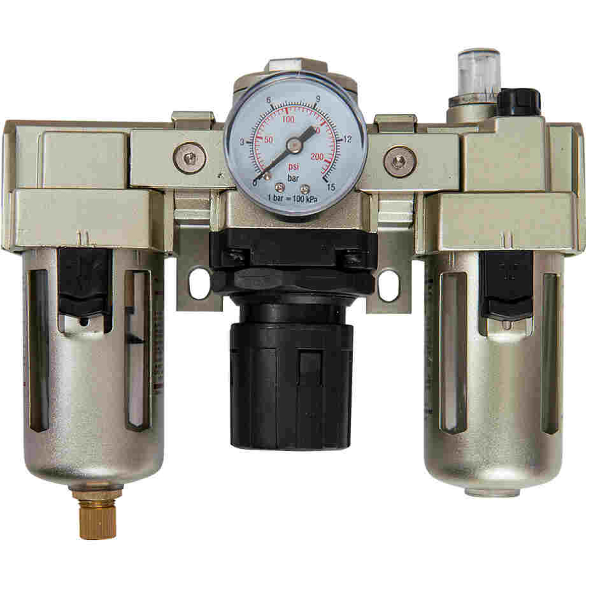 Ökonoomne ja koheselt kasutamiseks valmis lahendus õhutrassist niiskuse eemaldamiseks, õhusurve reguleerimiseks ja tööriistade õlitamiseks. 1/4” sisendiga, poolautomaatse tühjendusklapiga, maksimaalselt 10 bar´isele õhusurvele, Seinakinnituse ja manomeeteriga.