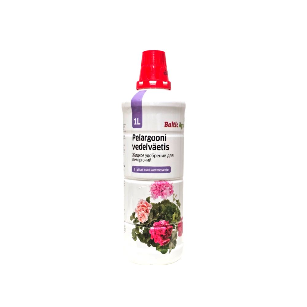 Pelargooni vedelväetis 1l – Kiiretoimeline veeslahustuv mikroelementidega täisväetis kõikide pelargoonide, surfiiniate, rooside, petuuniate, sarvkannikeste, lobeeliate, krüsanteemide, levkoide, peiulillede, leeklillede, lõvilõugade, raudürtide jt rõdu-, ampli- ja suvelillede kastmisväetamiseks.