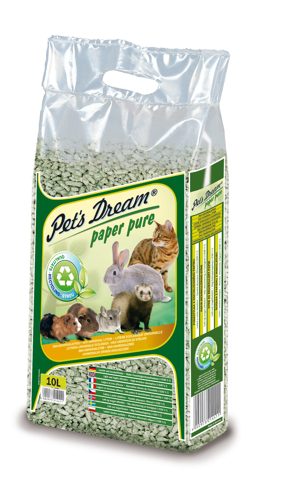 Pet’s Dream Paper Pure ümbertöödeldud paberi kiududest allapanu kassidele, jänestele, närilistele ja lindudele.
