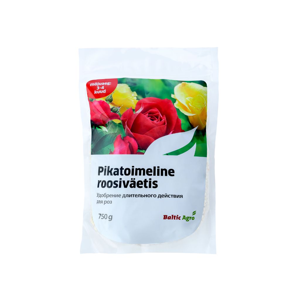Pikatoimeline roosiväetis 3-4 kuud 750g – Graanulitena väetis, mis vabastab toitaineid järk-järgult, tagades roosidele tugeva kasvu ja rikkaliku õitsemise kuni nelja kuu vältel.