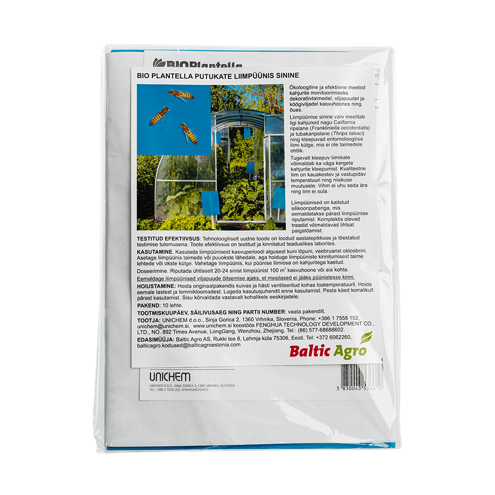 Putukate liimpüünis sinine (10 tk) on loodushoidlik ja tõhus vahend kahjurite jälgimiseks kasvuhoonetes ja õuetaimede juures. Sinine värv ja tugev liim tagavad täpse kahjurite püüdvuse ilma taimi kahjustamata.