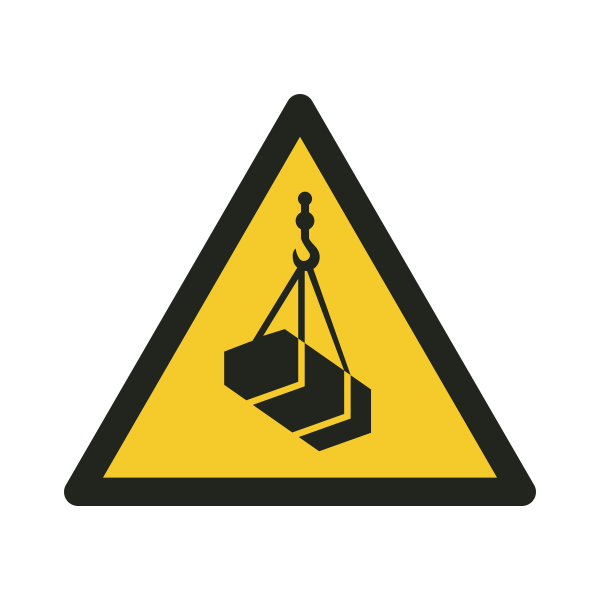 Rippuva koorma oht kleebis hoiatab selgelt piirkonnast, kus liigutatakse või hoitakse rippuvaid raskeid koormaid, ning aitab ennetada vigastusi tööstuses, ehitusplatsidel või ladudes.