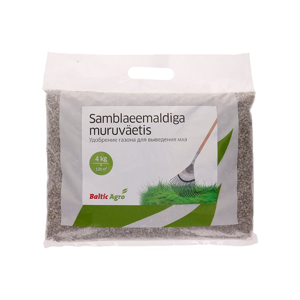 Samblaeemaldiga muruväetis 4 kg – Baltic Agro granuleeritud väetis, mis aitab murul võidelda sambla vastu ning toetab tugeva, lopsaka rohelise murukatte tekkimist. Ideaalne lahendus tiheda, toitainetevaese või niiske ja varjuga muru parandamiseks.