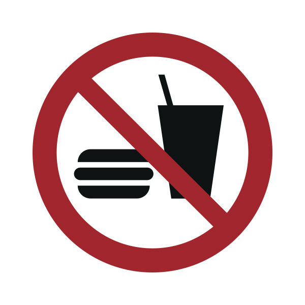 Söömise ja joomise keelamise kleebis annab selge hoiatuse, et söömine ja joomine selles piirkonnas on keelatud, aidates säilitada puhtust ja ohutust tööstus-, labori- või avalikes ruumides.