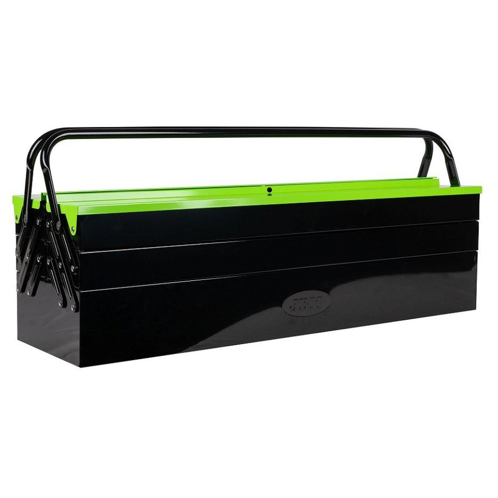 Tööriistakast Steel 450 mm on valmistatud vastupidavast, paksemast terasplekist, pakkudes suurepärast töökindlust ka raskemate tööriistade hoiustamiseks ja transportimiseks. Sellel on kaks kandmiskäepidet, mis võimaldavad mugavalt ja ohutult transportida suurema kaaluga tööriistu. Lahtiklapitav disain koos kahe tasandi ja viie sektsiooniga tagab hea organiseerituse. Kast on kaetud õli- ja keemiakindla värviga ning sellel on lukustatav kaaneosa, mis pakub lisaturvalisust.