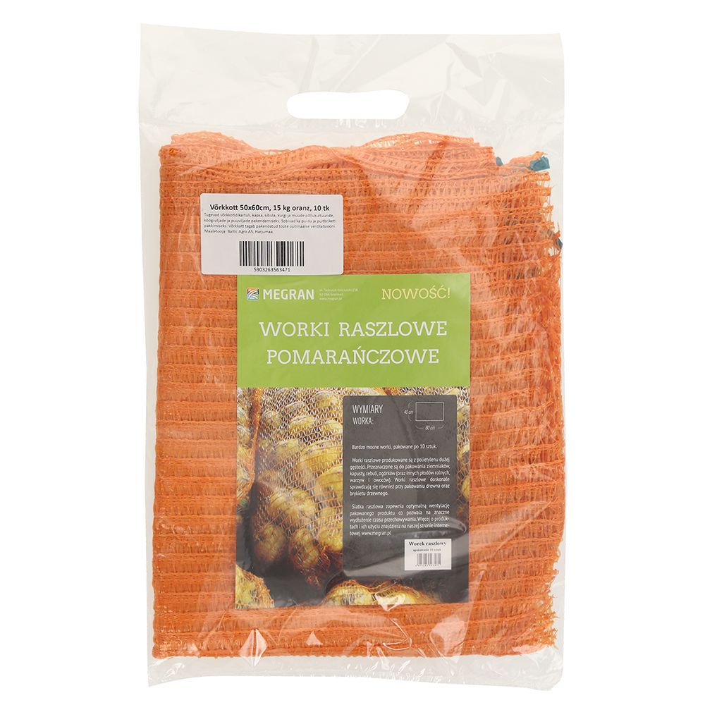 Võrkkott 50 x 60 cm (15 kg), oranž, 10 tk komplektis on sobilik lahendus puu- ja köögiviljade mugavaks pakkimiseks, hoiustamiseks ja transportimiseks. Hingav materjal aitab säilitada saagi värskuse.